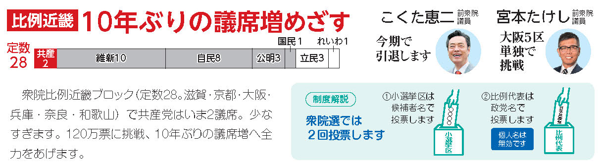 日本共産党京都府委員会は、比例代表での躍進をたたかいの中軸にすえ、「比例650万票、10%以上」を獲得し、定数28の近畿ブロックでは「近畿120万票、京都25万票 2議席絶対確保し、3議席必ず」を目標にたたかいます。